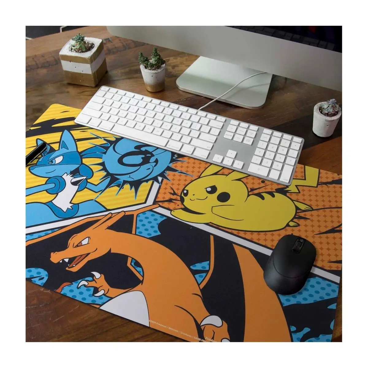 Pikachu, Charizard, and Lucario are ready to spring into battle on this Pokémon TCG accessory that shows off a comic book-style design in bright colors. Made of grippy neoprene, this playmat is a prime place to play a game or even to put underneath your mouse while you use the computer.